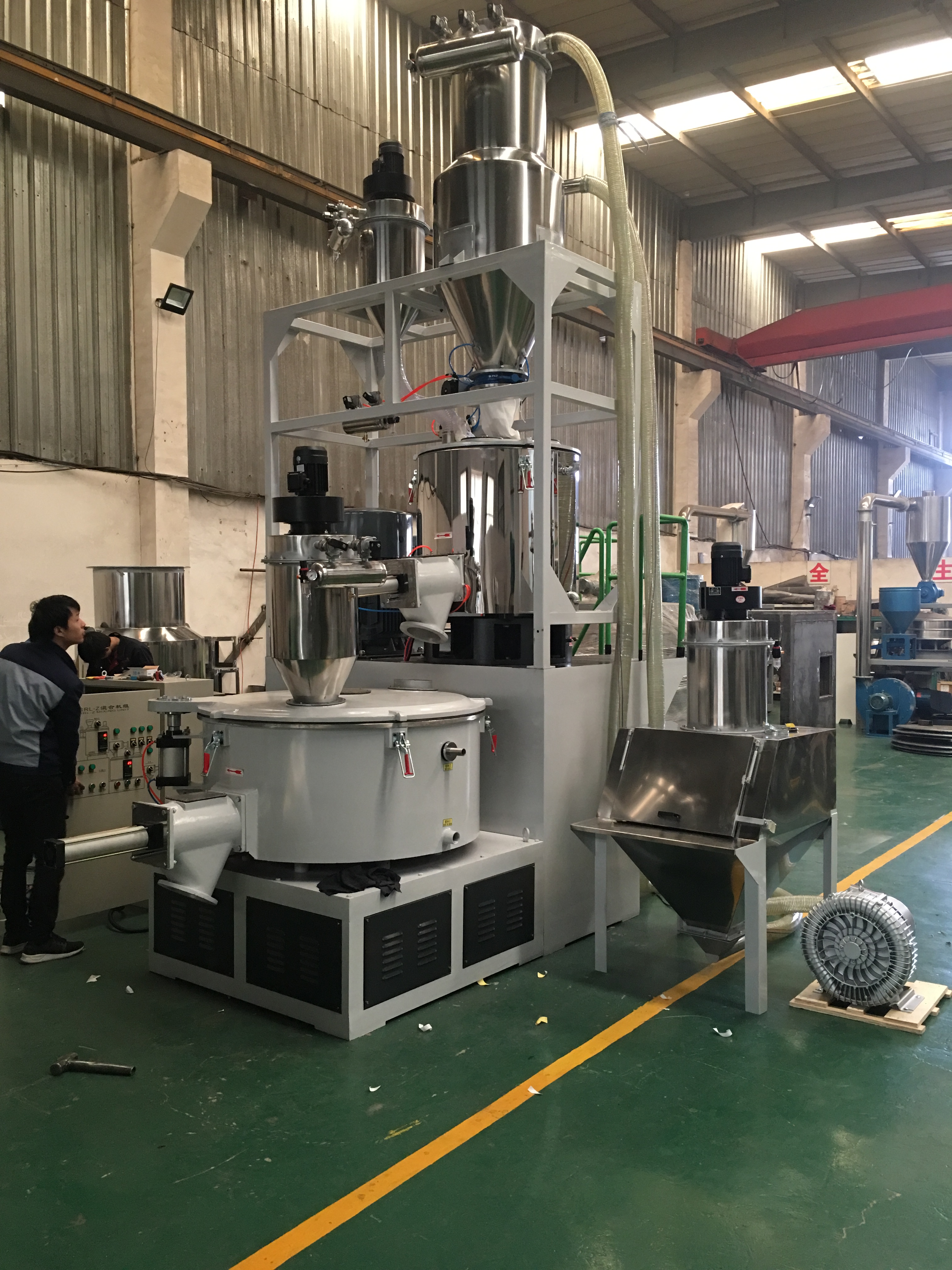 高速混合机组是引进消化并吸收先进技术研制而成,混合物料采用负压混合原理。电器仪表全部采用进口名牌电器,并可采用PLC程控或电脑控制。具有自动化程度高,混合速度快,可采用变频调速控制,其桨叶为精密不锈钢压力铸造,且通过静动平衡测试。特别是冷却机桨叶采用国外先进的螺旋搅拌结构,整个容器没有死角,具有冷却速度快,出料干净,混合效果已达到国外先进水平。