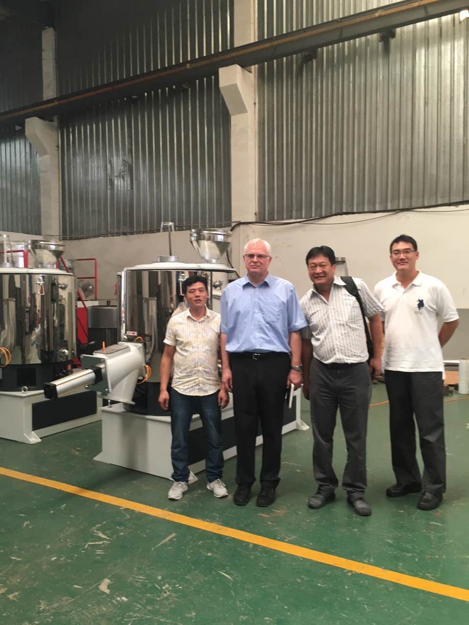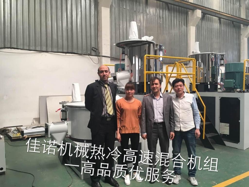 混合机的搅拌浆,由电机经皮带来驱动,但必须注意:欲高速运转时,应使电机先低速启动后,再高速运转主轴由轴承去承运转。主轴上部有三个搅拌浆,它们顺时针方向旋转,使物料一方面沿锅壁运动,又同时上下循环翻动加上导流板的作用,使混合效果更好。由于物料是高速运动的,所以料粒之间,料与浆之间的摩擦热很大,它使料温迅速上升。不仅相应地减少了锅壁的加热量,而且利于树脂对增速剂的吸收效果。搅拌浆是不锈钢制造的又经过仔细的机械加工耐磨、耐腐蚀。
